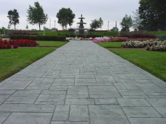 路段设计边坡1:1.5,砌护为20cm厚 C20混凝土压花现浇,拉模施工,每个浇注 块尺寸5m?5m。在作景观设计时,曾考虑采用现场压制和预制压花板贴面两种方法。预制压花板厚5 cm,可在预制厂集中制作,待渠道边坡混凝土压花浇注完毕且达到一定强度后再用M10水泥砂浆贴面。由于渠道边坡位于水位变动区,如果采取预制贴面的方 法,一 旦预制压花板与现浇混凝土粘结不牢固,水流将会对装饰层淘刷,造成装饰层剥离,影响渠道美观和耐久性能。采取现场压制的方法,装饰层和混凝土结构层能很好 地结合为一个整体,不会发生装饰层剥离等现象,因此,渠道边坡采用现浇混凝土表面直接压花的方法施工。渠道顶部挡土墙临水面位于水上,而且为直立面,故采 取预制压花板贴面的方法施工。预制压花板厚5 cm,用10mm厚M10水泥砂浆与现浇混凝土压花粘结。考虑到与公园周围景观的协调一致,装饰层采用淡灰仿蘑菇状条石图案。